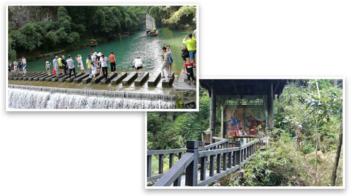 下午,乘坐大巴在導游的氣氛活躍下,很快便到了依山傍水,風情淳樸的三峽人家,白墻青瓦石板路,小橋流水吊腳樓的意境在此可領略一番。