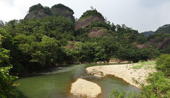 九曲雖為溪,但水面寬闊,水量充沛,一點也不像常規(guī)見到的溪流。曲折縈回的九曲溪貫穿于丹崖群峰之間,如玉帶串珍珠,將36峰,99巖連為一體,構(gòu)成"一溪貫群山,兩岸列仙岫"的獨特自然美景。