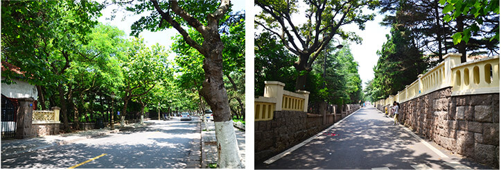 老城區(qū)的法國梧桐夏季里枝繁葉茂,由于路窄樹多,遠(yuǎn)遠(yuǎn)看去,馬路幾乎被樹葉完全遮掩。造型優(yōu)美的德式老建筑優(yōu)雅的隱匿于馬路邊的梧桐樹葉中,靜靜的冷冷的佇立著,卻并不顯得孤清,一百多年了,承接并見證著歷史,它早已融入到這座城市,沒有一絲的突兀。精心雕刻花紋的木質(zhì)窗欄與窗沿,銅質(zhì)的門扶手,匠心獨(dú)具的院墻以及院內(nèi)的花圃,竹子和紫藤環(huán)繞著,無不顯示出過去的主人優(yōu)越的生活和非凡的品味。我想,那些紫藤是否會(huì)在深夜彌漫出迷人的香氣呢?還有那些教堂,肅穆寧靜,歷史就這么一點(diǎn)一滴的沉淀下來,光鮮下亦有血淚與戰(zhàn)火。